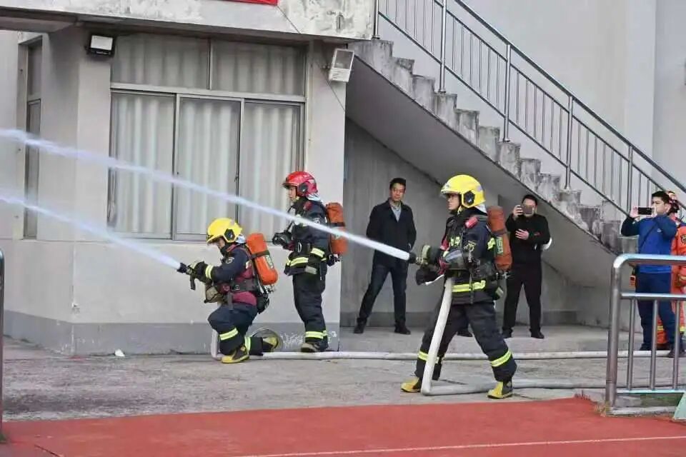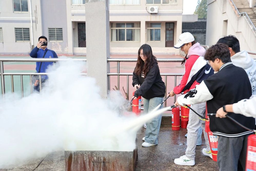 本次演练特别安排了灭火器实操环节,学生代表现场参与了灭火器使用的实操。在消防队员的专业指导下,同学们认真学习灭火器“提、拔、握、压”核心操作要领,将理论知识转化为实战能力。中山路专职消防队的消防队员,现场讲解并演示了消防栓的使用要领,让同学们对如何使用消防栓等消防器材有了更清晰的认识。