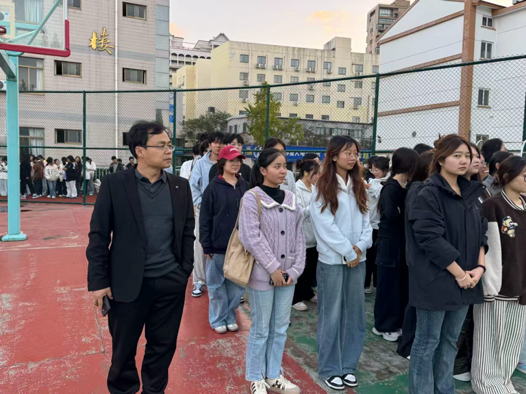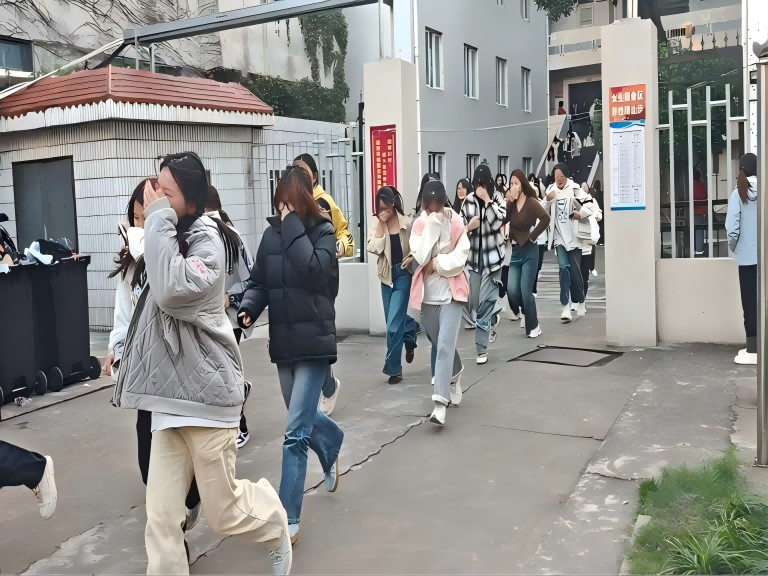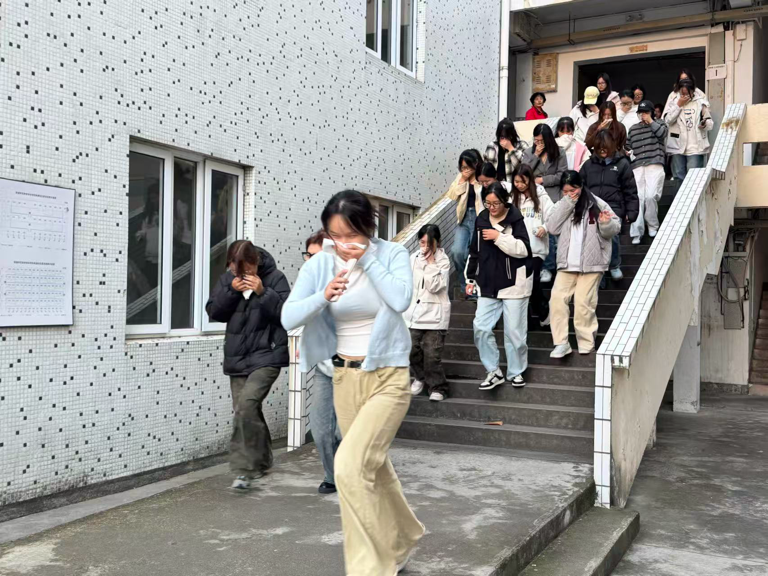 当天16时30分,消防警报骤然响起,应急疏散演练正式启动。各宿舍学生迅速进入应急状态,在辅导员、生活指导老师、自管会保卫部成员的指挥下,按照预设路线,从顶层依次向一楼有序撤离。学生们全程保持“弯腰、捂口鼻”的规范姿势,沿栏杆或墙壁快速行进,整个过程紧张有序、忙而不乱。全体师生在最短时间内安全抵达操场指定集合点。随后,以宿舍为单位进行人数清点,由寝室长报至班级负责人,负责人汇总后统一反馈给辅导员,实现人员统计闭环管理,确保全员到齐、无一遗漏。