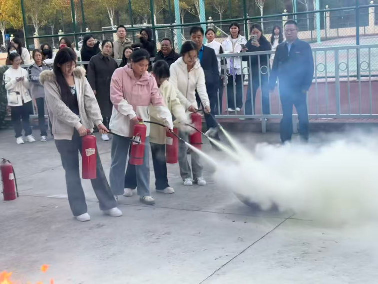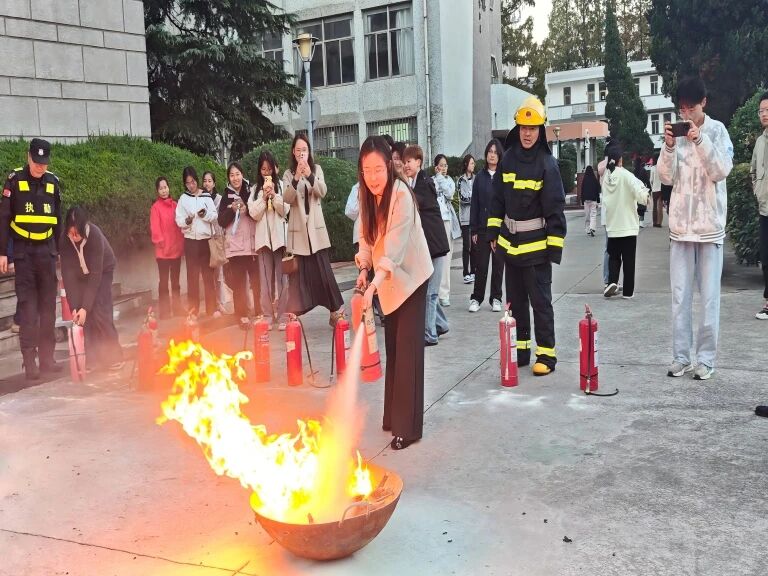 在灭火器实操环节,通过专业人员对火灾类型、灭火器种类及适用场景的现场讲解,同学们进一步加深了对消防知识的了解,并重点演示了“提、拔、握、压”四字使用口诀,强调应对准火焰根部进行喷射。在专业人员的指导下,师生们分组上场,亲手操作灭火器扑灭模拟火源。通过零距离接触和实战化训练,师生们切实掌握了扑救初期火灾的关键技能,增强了应对火情的信心。